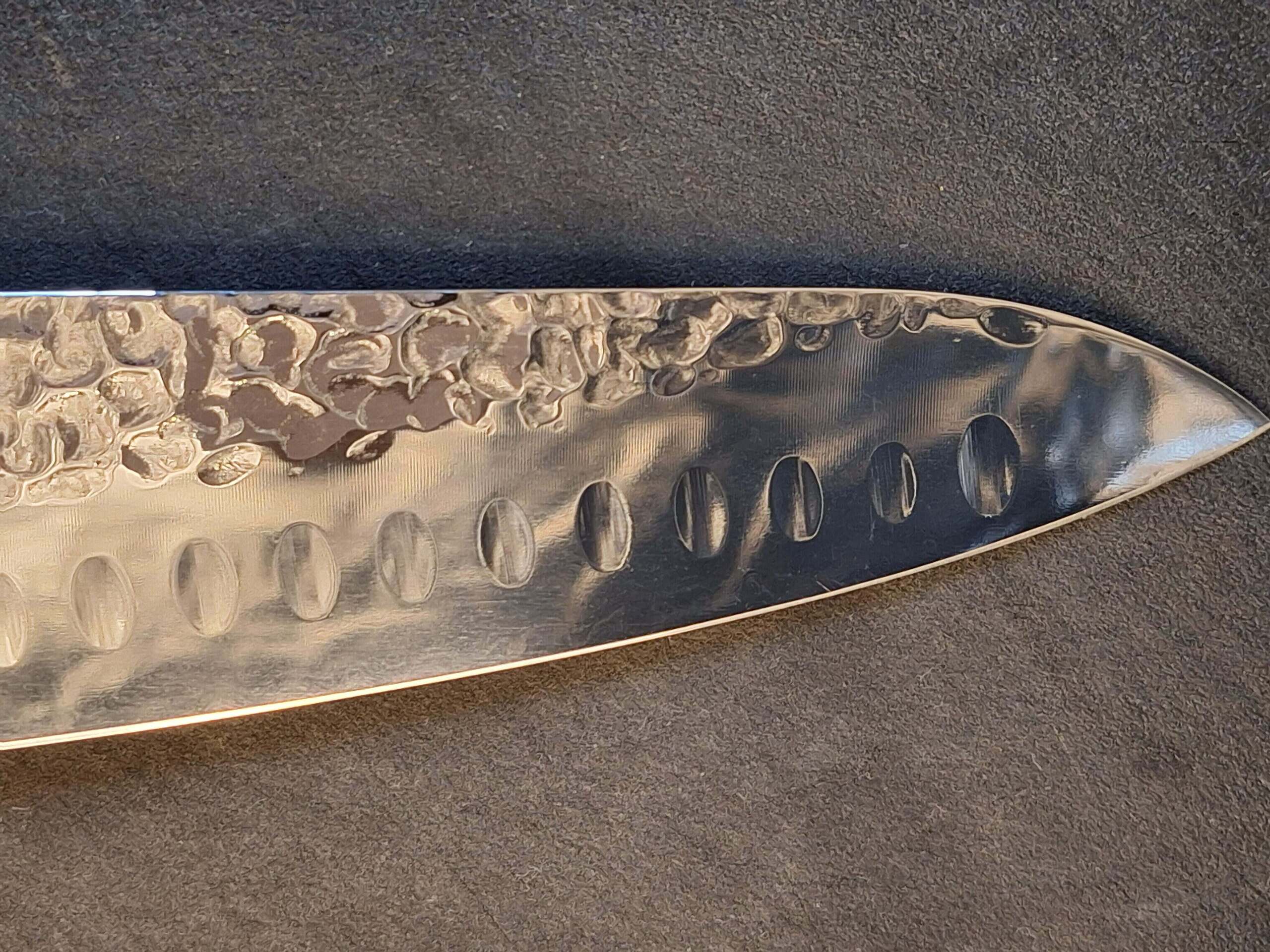 Es steckt viel Raffinesse im MAC Nashiji Küchenmesser. Durch die ungleichmäßige Form und satinierte Oberfläche der Klinge, entsteht Raum zwischen Lebensmittel und Stahl. Die Reibung wird verringert und das Schneiden enorm erleichtert. Darüber hinaus bilden die Kullen an der Schneide ebenfalls Luft zum Lebensmittel beim Schneiden. Dies perfektioniert die effektive Handhabung. Die Struktur des Messers erhöht den Winkel des Griffs. So können Zutaten in natürlicher Position geschnitten werden, ohne zu verrutschen. Ein weiteres Highlight ist die Hochglanzpolitur des Stahls. Dies hat nicht nur den Effekt wie ein Spiegel, sondern verringert durch die glatte Oberfläche die Reibung der Lebensmittel. Die Klingen gleiten förmlich durch das Schneidgut.